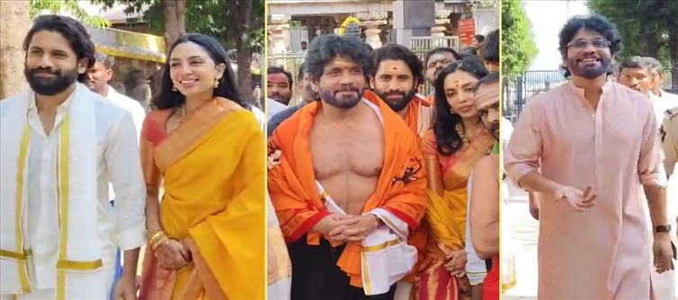 Reportedly Akkineni Nagarjuna’s family visited srisailam Mallanna Devasthanam yesterday, which was special. The newlyweds naga chaitanya and Shobhita also took part in the trip. The family visited the temple to pay respects to Swami and Ammavar. They performed Rudrabhishekam for the Swami. Later, the newlyweds received blessings with Vedic chants. Meanwhile the temple officials and priests warmly welcomed the family at the main gate. Photos and videos from the visit are being shared on social media. nagarjuna had recently posted wedding photos of naga chaitanya and Shobhita on his X account. He thanked fans and the media for their love and support.