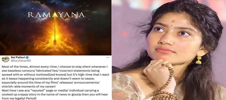 ప్రముఖ తమిళ్ పత్రిక ఛానల్లో సాయి పల్లవి కి సంబంధించి ఓ వార్త ప్రచురితమైంది . "రామాయణం సినిమా కోసం ఆమె పూర్తిగా నాన్ వెజ్ మానేసింది అని.. అంతేకాకుండా సాయి పల్లవి ఒక ప్రత్యేకమైన చెఫ్ బృందాని నియమించుకుందని..ఆమె ఎక్కడికి వెళ్తే అక్కడికి ఆ చెఫ్ బృందాని తీసుకువెళ్తుంది అని.. సాయి పల్లవి రామాయణం సినిమా కోసం ఎక్కువగా కష్టపడుతుంది అన్నట్లు ఆ వార్త ప్రచురితమైంది . అయితే సాయి పల్లవి ఆ లింక్ షేర్ చేస్తూ మరొకసారి ఇలాంటి తప్పుడు వార్తలు రాస్తే ఈసారి ఊరుకోను.. ఇన్నాళ్లు నేను చాలా సైలెంట్ గా ఉన్నాను.. నాకెందుకులే నాకెందుకులే అని వదిలేసాను.. కానీ ఈసారి మాత్రం లీగల్గా యాక్షన్ తీసుకుంటాను" అంటూ స్ట్రైట్ గా వార్నింగ్ ఇచ్చింది .
