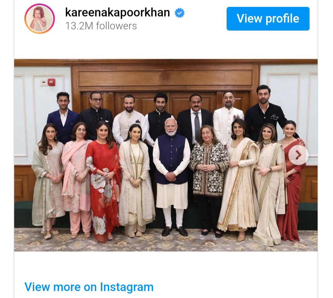 Kareena shared a series of pictures on Instagram, featuring the Kapoor family with the Prime Minister. One of the photos included a signed note from the PM for Kareena's sons, Taimur and Jeh. She captioned the post: “We are deeply humbled and honored to have been invited by the Honourable prime minister, Shri narendra Modi, to commemorate the extraordinary life and legacy of our grandfather, the legendary raj Kapoor.”
