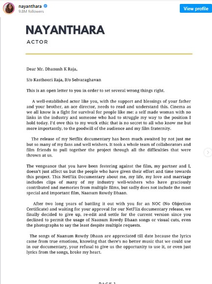 Actress Nayanthara wrote a condemnation letter on November 16, two days before the release of her Netflix film, after dhanush sent her a legal notice for using BTS clips in his documentary. She claimed that she and her husband Vignesh had gone to dhanush to seek permission to use the content of 'Nayanam Rowdy Dhan' in the documentary, but he refused. After this, they went ahead. Later Dhanush sent her a legal notice. dhanush also filed a civil suit in the madras high court against Nayanthara, Vignesh, and Netflix for using the content of Naanum Rowdy Dhaan. Nayanthara said that the BTS footage they used were random videos taken on her and others in the crew's phones. It was not official footage. The legal battle between Nayanthara, Vignesh, and Dhanush is still going on.