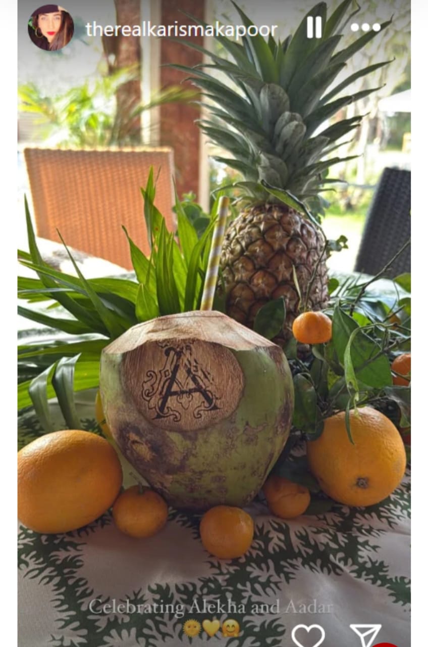 In other photos, Aadar and Alekha can be seen entering together and enjoying their special day. Aadar's cousin karisma kapoor has also posted on instagram for the couple. Sharing a photo of customized coconut water with A written on it - 'Celebrating Alekha and Aadar.' Apart from this, Neetu Kapoor has also shared a group photo from the wedding.