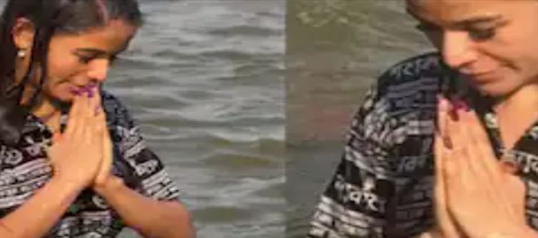 Poonam Pandey, known for her outspoken style and bold roles, was wearing a shirt with Mahakal written on it while taking a dip at the Sangam bank. After taking a dip in the Sangam, poonam pandey is praying with folded hands.