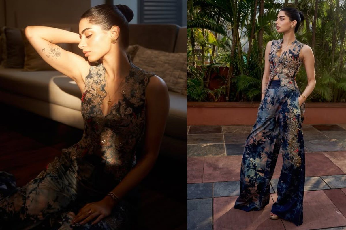 Khushi teamed her ensemble with a couple of wide-legged tie-dye trousers. The subtle appliqué embroidery along the prints introduced an oomph issue to her universal appearance. She accessorised her waistcoat co-ord set with uniquely designed bracelets in golden colors, stud jewelry and a swish necklace that gave a touch of her personal style.