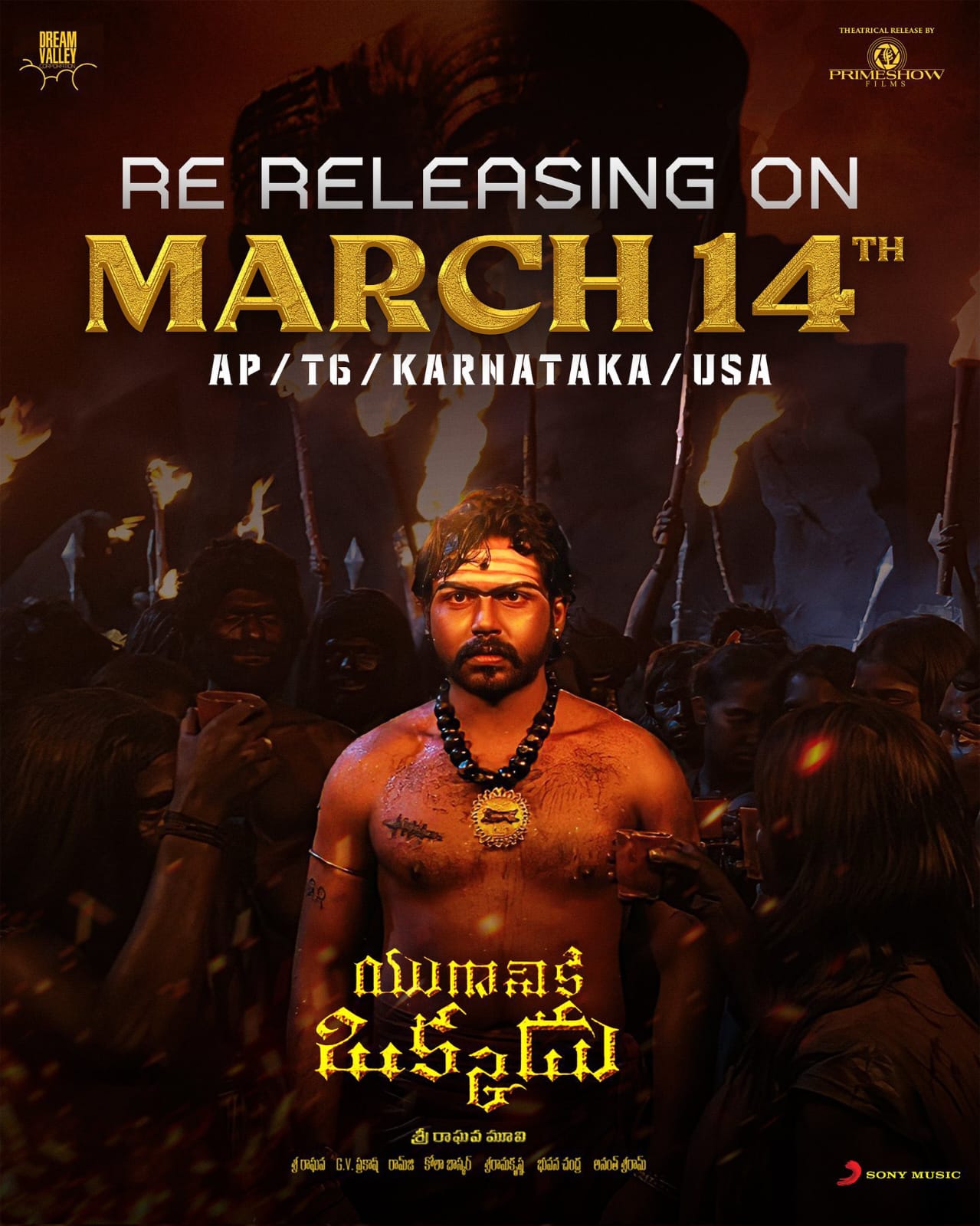 ఇకపోతే తెలుగు లో మంచి విజయం సాధించిన యుగానికి ఒక్కడు సినిమాని మళ్లీ రిట్ రిలీజ్ చేయబోతున్నారు. తాజాగా అందుకు సంబంధించిన అధికారిక ప్రకటన కూడా వెలువడింది. ఇకపోతే ఈ మూవీ ని మార్చి 14 వ తేదీన ఆంధ్ర ప్రదేశ్ , తెలంగాణ , కర్ణాటక యూ ఎస్ ఏ లో రీ రిలీజ్ చేయనున్నట్లు ఈ మూవీ బృందం వారు అధికారికంగా ప్రకటిస్తూ ఓ పోస్టర్ ను కూడా విడుదల చేశారు. ప్రస్తుతం ఆ పోస్టర్ సోషల్ మీడియాలో ఫుల్ గా వైరల్ అవుతుంది.