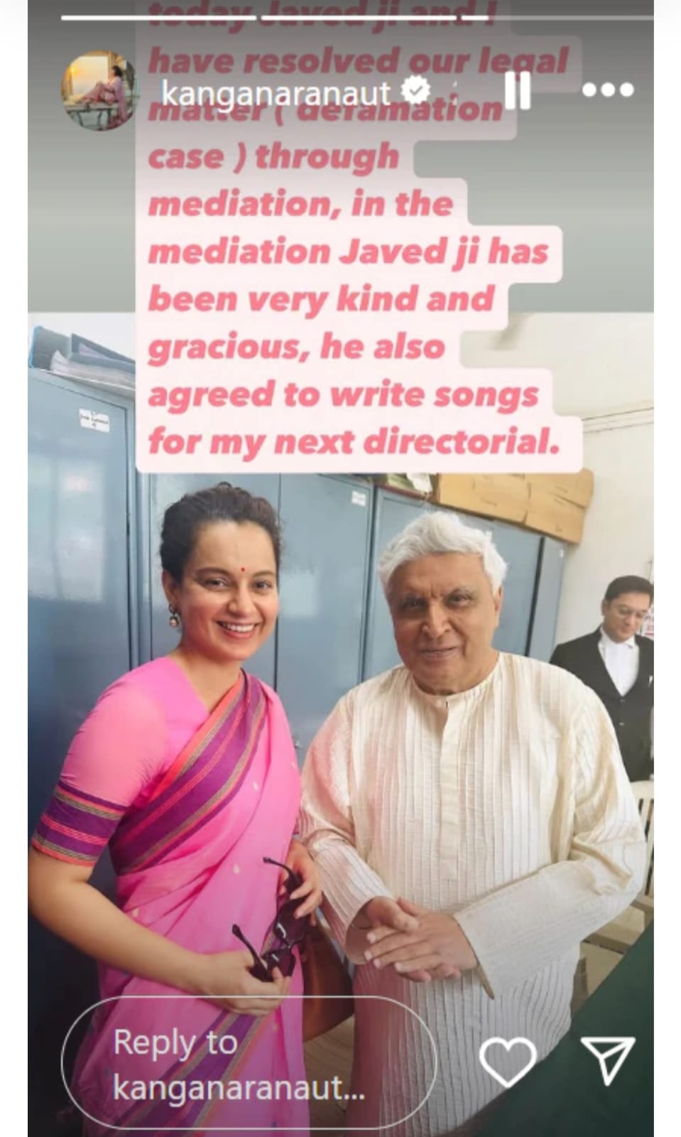 After reconciliation with javed akhtar in the defamation case, kangana Ranaut has posted a post on Instagram story. The actress has shared a photo of herself with javed akhtar from the court itself. Along with this, she has told in the caption that after reconciliation, javed akhtar has also agreed to write songs for the actress's film.