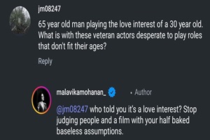 అలా మాలవిక మోహనన్ పెట్టిన పోస్ట్ కి కూడా ఓ వ్యక్తి షాకింగ్ కామెంట్ పెట్టాడు. 65 ఏళ్ల వయసున్న ముసలి హీరోకి 30 ఏళ్ల వయసు ఉన్న హీరోయిన్ తో ప్రేమాయణం.. ఇదేంటో అర్థం అవ్వడం లేదు..ముసలి హీరోలు తమ ఏజ్ కు తగ్గట్టు పాత్రలు ఎందుకు ఎంచుకోవడం లేదో అర్థం అవ్వడం లేదు అంటూ షాకింగ్ కామెంట్ పెట్టాడు. అయితే ఈ కామెంట్ చూసిన మాళవిక మోహనన్ స్పందిస్తూ.. నేను ఈ సినిమాలో అతనితో ప్రేమలో పడ్డాను అని నీకు ఎవరైనా చెప్పారా.. నువ్వు ఎందుకు ఊహించుకుంటున్నావ్.. నీ ఊహల్లో నీవు ఏదేదో ఊహించుకొని కథలు అల్లేసుకొని ఇతరులను నిందించడం మానుకో అంటూ స్ట్రాంగ్ రిప్లై ఇచ్చింది.ప్రస్తుతం మాళవిక మోహనన్ ఆ నెటిజన్ కి ఇచ్చిన రిప్లై నెట్టింట వైరల్ అవ్వడంతో మాళవిక మోహనన్ పెట్టిన పోస్ట్ కి పలువురు నెటిజన్స్ మద్దతు తెలుపుతున్నారు.