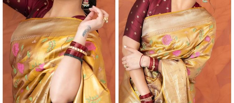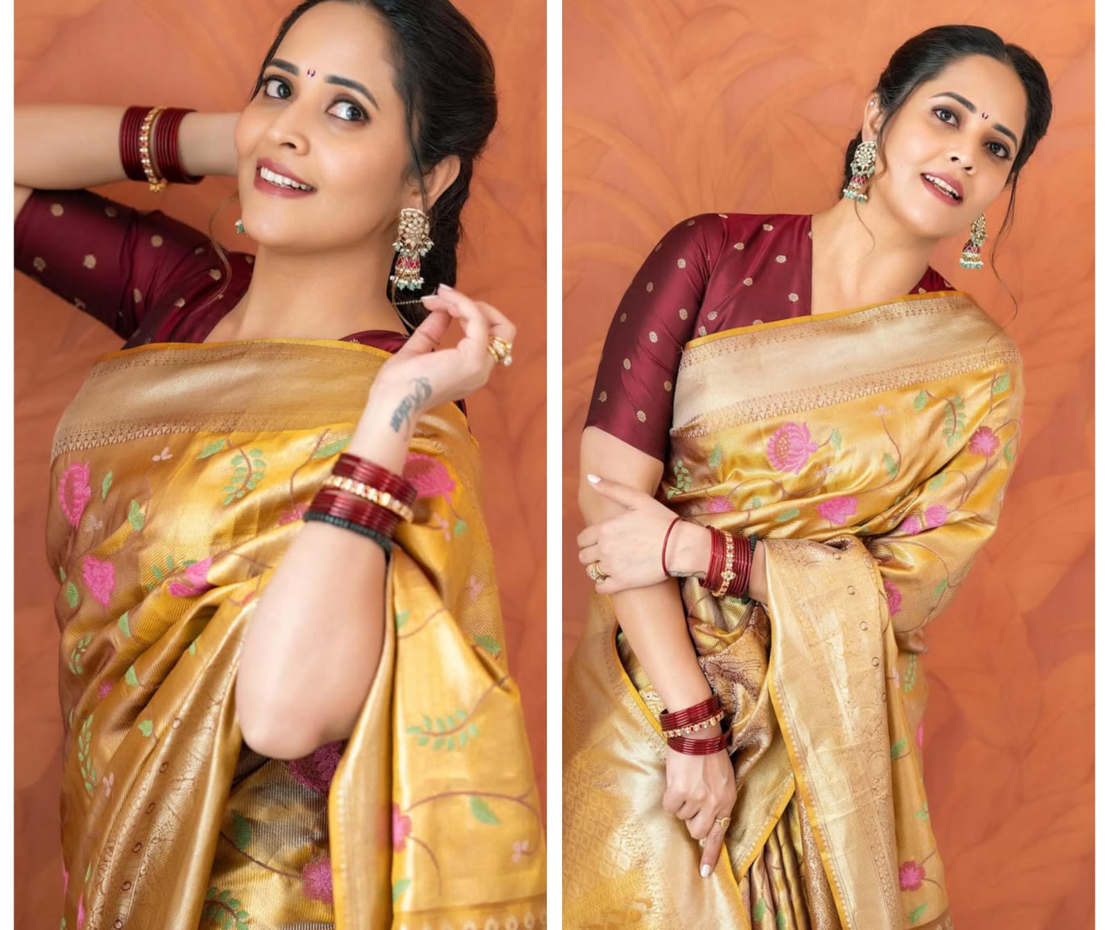 ఇది ఇలా ఉంటే ప్రస్తుతం అనసూయకు సంబంధించిన కొన్ని ఫోటోలు వైరల్ అవుతున్నాయి. ప్రస్తుతం వైరల్ అవుతున్న ఫోటోలలో అనసూయ అదిరిపోయే లుక్ లో ఉన్న యెల్లో కలర్ శారీని కట్టుకొని , మెరూన్ కలర్ లో ఉన్న బ్లౌజ్ ను ధరించి ఫోటోలకు స్టిల్స్ ఇచ్చింది. ప్రస్తుతం అనసూయకు సంబంధించిన ఈ చీరకట్టులో ఉన్న ఫోటోలు సూపర్ గా వైరల్ అవుతున్నాయి.
