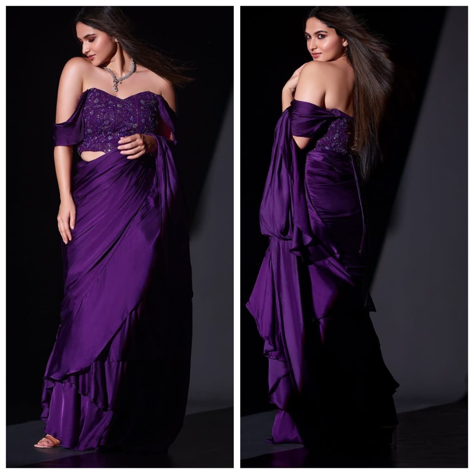 తాజాగా ఈమె అదిరిపోయే లుక్ లో ఉన్న పర్పుల్ కలర్ శారీని కట్టుకొని అందుకు తగిన బ్లౌజ్ ను ధరించి తన నడుము మరియు బ్యాక్ అందాలు ప్రదర్శితం అయ్యేలా ఫోటోలకు స్టిల్స్ ఇచ్చింది. ప్రస్తుతం ఈ బ్యూటీ కి సంబంధించిన ఈ ఫోటోలు సోషల్ మీడియాలో వైరల్ అవుతున్నాయి.