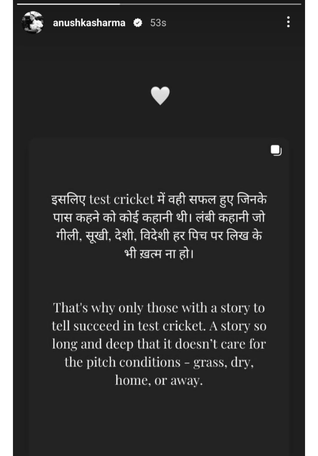 Anushka Sharma has shared a post. It reads, 'That's why only those who had a story to tell succeeded in Test cricket. A long story that does not end even after writing on every pitch, wet, dry, desi, videshi.' anushka has made a white emoji with this post.