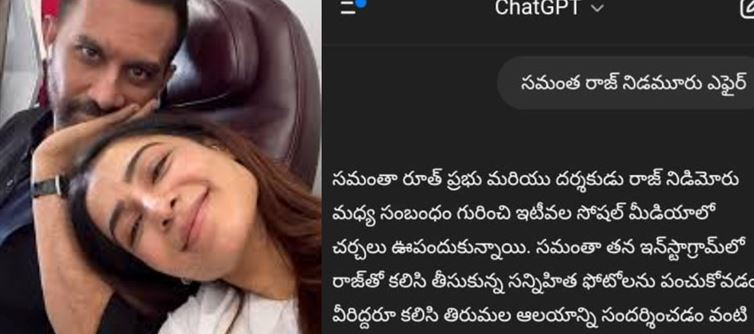 దానికి తగ్గట్టే రాజ్ నిడమోరు భార్య కూడా పెట్టిన పోస్ట్ అందరికీ కొత్త డౌట్లు వచ్చేలా చేసింది . రాజ్ నిడమోరు భార్య పెట్టిన పోస్ట్ పరోక్షకంగా సమంత - రాజ్ నిడమోరు రిలేషన్ షిప్ ను కన్ఫామ్ చేసేసినట్లు అయ్యింది. దీంతో సోషల్ మీడియాలో వీళ్ళ గురించి వీళ్ళ బంధం గురించి రకరకాలుగా వార్తలు వినిపిస్తున్నాయి . అయితే కొంతమంది చాట్ జీపీటీని వీరిద్దరి రిలేషన్ షిప్ నిజమేనా..? త్వరలోనే సమంత రెండో పెళ్లి చేసుకుంటుందా..? అంటూ అడుగుతున్నారు . ఈ మధ్యకాలంలో చాట్ జీపీటీ ఎంత పాపులర్ అయ్యిందో అందరికీ తెలిసిందే .
