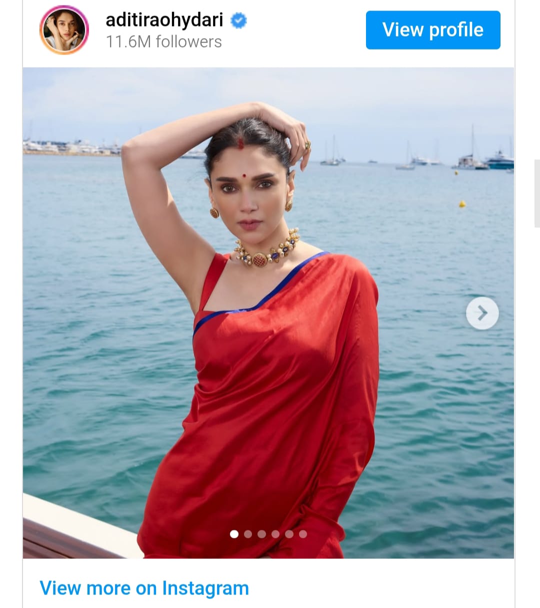 Not only aishwarya Rai but Hiramandi actress Aditi Rao Hydari was also seen flaunting sindoor in her parting on the red carpet of Cannes. Aditi had shared pictures of her Cannes look on her insta account in which she was seen in a red saree, had a bindi on her forehead, and was wearing a choker set around her neck. Aditi completed her Cannes look by applying sindoor in her maang. These pictures of her are going viral on social media and fans claim that the actress has paid tribute to the indian Army's Operation Sindoor with her sindoor look.