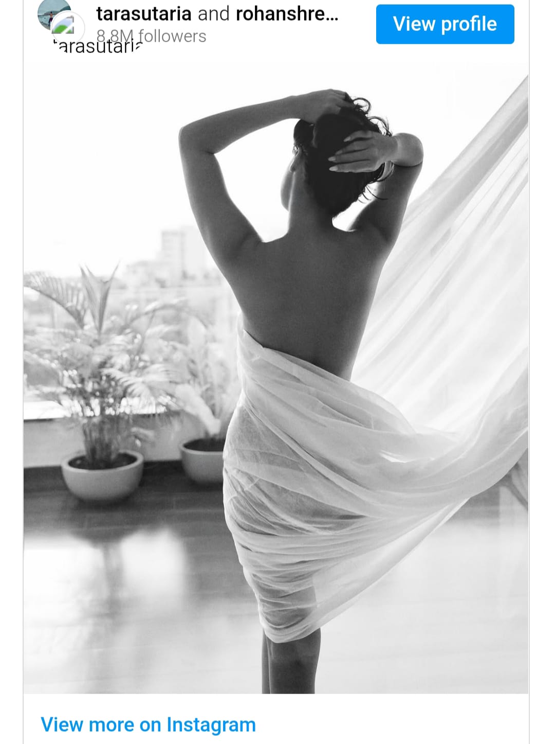 In the photo, tara is seen casually tying her hair while gazing out into the distance. The only element draping her body is a soft white curtain that subtly covers the front and lower half of her torso. Captioning the picture, tara wrote, "Afternoons at home with my darling friend @rohanshrestha spent creating.. draping.. and feeling nostalgic and inspired by 90’s grainy black and white