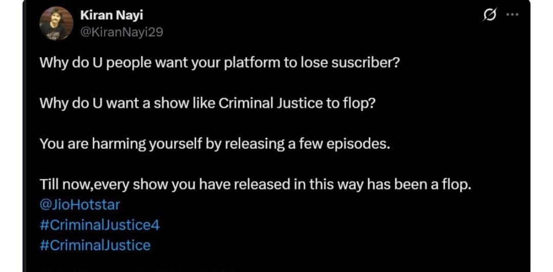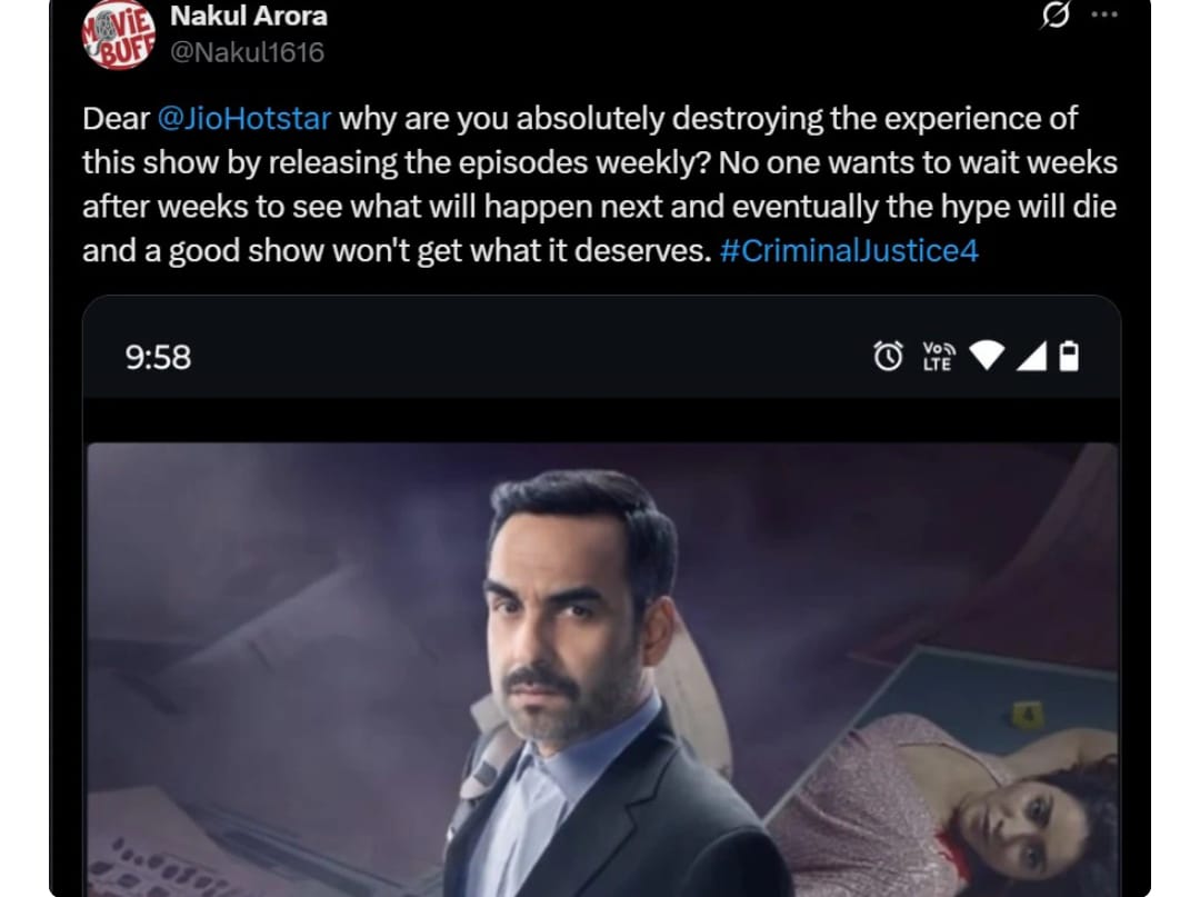 Sheikh further wrote angrily, "What kind of justice system is this that only one episode will be shown every Thursday? Fans want criminal justice, not episodic torture'' At the same time, a user tagged JioHotstar and asked, ''Why are you completely spoiling the fun of this show by releasing one episode a week.''