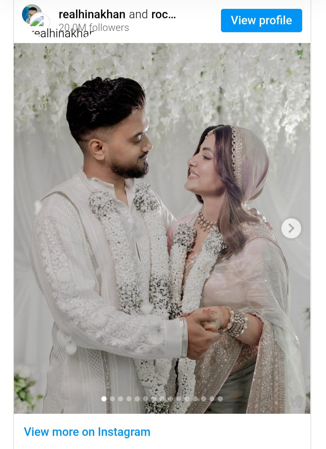 TV actress Hina Khan has married her long-time boyfriend rocky Jaiswal. The actress secretly got married in an intimate ceremony, pictures of which have surfaced. The actress, who is battling breast cancer, has had a court marriage with rocky Jaiswal. Hina Khan has shared her wedding photos on her Instagram.