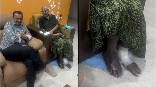 In this viral picture, kota srinivasa rao looks very weak and tired. Seeing the fatigue on his face and the weakness in his body, fans have become very worried. The bandage on his leg and the injury marks on the other leg can be seen in the picture. It is being told that bandla ganesh made a courtesy visit to Kota to inquire about his health and he shared this picture taken during that time on social media. While sharing the picture during the meeting, he wrote in the caption - 'It was very nice to meet Kota srinivas Rao...'