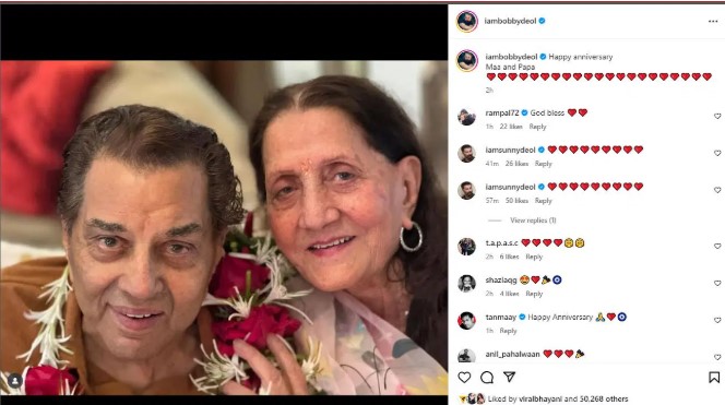 Bobby Deol shared a special picture of his father dharmendra and his mother Prakash Kaur on his instagram and also wrote in the caption, 'Happy Anniversary Maa and Papa.' Along with this, bobby has made many red heart emojis. Arjun Rampal wrote in this post of bobby, 'God bless.' At the same time, sunny deol has shared many red heart emojis twice on this post of Bobby. Actor Tanmay Ranjan wrote, 'Happy Anniversary.'