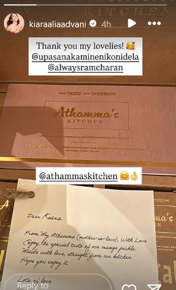 Kiara enjoyed the mango pickle sent by ram charan and upasana during her pregnancy. She has also thanked them for this by sharing a post on her instagram story. upasana has written a note along with the pickle. It reads, 'Dear kiara, on behalf of my Athamma (mother-in-law), enjoy the special taste of our mango pickle made with love. It is made with love, straight from our kitchen. Hope you like it. Lots of love to you.