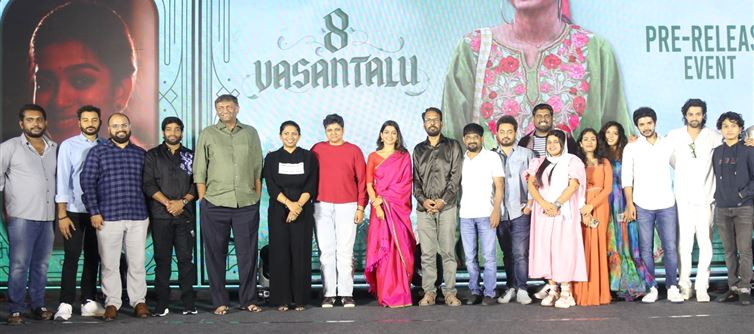 పాన్ ఇండియా నిర్మాణ సంస్థ movie MAKERS' target='_blank' title='మైత్రి మూవీ మేకర్స్-గురించి లేటెస్ట్ అప్డేట్స్, ఫోటోలు, వీడియోల కొరకు వెంటనే క్లిక్ చేయండి. '>మైత్రి మూవీ మేకర్స్ నిర్మించిన '8 వసంతాలు' ప్రేక్షకులను అలరించడానికి సిద్ధమౌతోంది. ఈ చిత్రానికి ఫణీంద్ర నర్సెట్టి దర్శకత్వం వహించారు. అనంతిక సునీల్కుమార్ లీడ్ రోల్ పోషించారు. నవీన్ యెర్నేని, వై. రవిశంకర్ నిర్మించిన 8 వసంతాలు సోల్ఫుల్ సినిమాటిక్ ఎక్స్పీరియన్స్ ఇవ్వబోతోంది. ఇప్పటికే విడుదలైన ప్రమోషనల్ కంటెంట్కు మంచి రెస్పాన్స్ వచ్చింది. ఈ చిత్రం జూన్ 20న వరల్డ్ వైడ్ విడుదల కానుంది. ఈ సందర్భంగా మేకర్స్ గ్రాండ్ గా ప్రీరిలీజ్ ఈవెంట్ నిర్వహించారు.