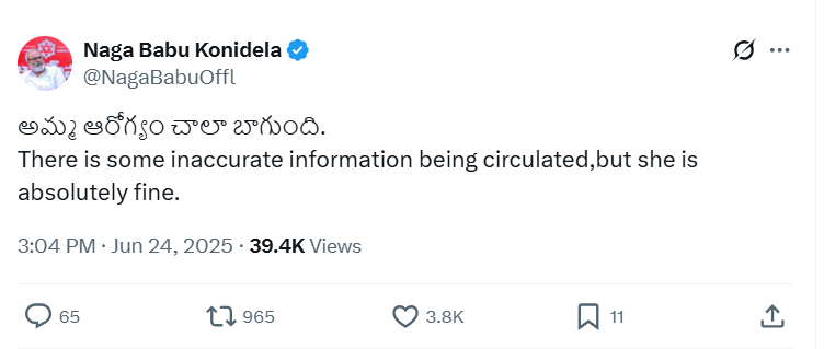 అలాగే అంజనా దేవి త్వరగా కోలుకోవాలని అంటూ సోషల్ మీడియా వేదికగా పోస్ట్లు పెడతం మొదలుపెట్టారు .. అయితే అంజన దేవి ఆరోగ్యం గురించి వస్తున్న వార్తలు పై మెగా బ్రదర్ నాగబాబు స్పందించారు .. ఈ మెరకు సోషల్ మీడియాలో ఆయన ఒక పోస్ట్ కూడా పెట్టారు .. అమ్మ ఆరోగ్యం చాలా బాగుంది .. అమ్మ ఆరోగ్యం గురించి తప్పుడు సమాచారం బయటకు వస్తుంది .. ఆరోగ్యపరంగా ఆమె ఎంతో క్షేమంగా ఉన్నారు అంటూ నాగబాబు తన పోస్ట్ లో క్లారిటీ ఇచ్చారు .. నాగబాబు పోస్టుతో మెగా అభిమానులు ఒక్కసారిగా ఊపిరి పీల్చుకున్నారు . అయితే వయసు పైపడుతున్న క్రమంలో అంజనా దేవి జనరల్ చెక్ అప్ కోసం తరచూ ఆసుపత్రికి వెళ్లి వస్తూ ఉంటారు .. ఈ క్రమంలోనే అంజనమ్మ ఆరోగ్యంపై ఈ తప్పుడు వార్తలు వస్తున్నాయని గతంలోను ఇలాగే జరగా మెగా ఫ్యామిలీ తర్వాత క్లారిటీ ఇచ్చింది .