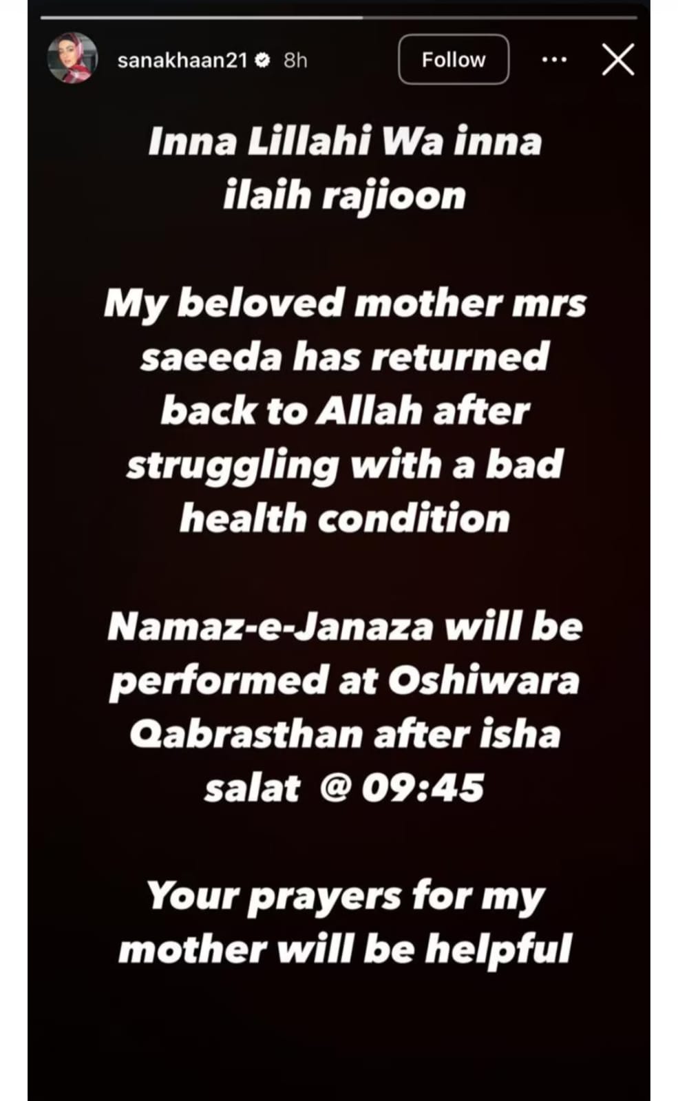 In a brief but deeply emotional note posted on her instagram Story, sana wrote, "Inna Lillahi wa inna ilayhi raji'un. My beloved mother Mrs. Saeeda has back returned to Allah after struggling with a bad health condition." She refrained from revealing further details regarding her mother’s illness or the cause of her death. Her mother’s age also remains undisclosed.