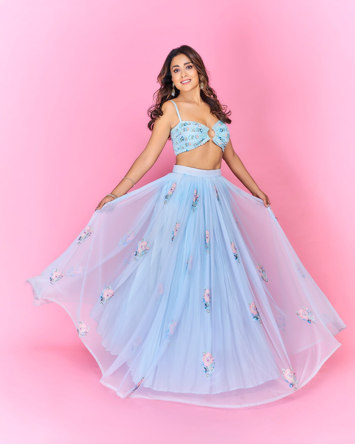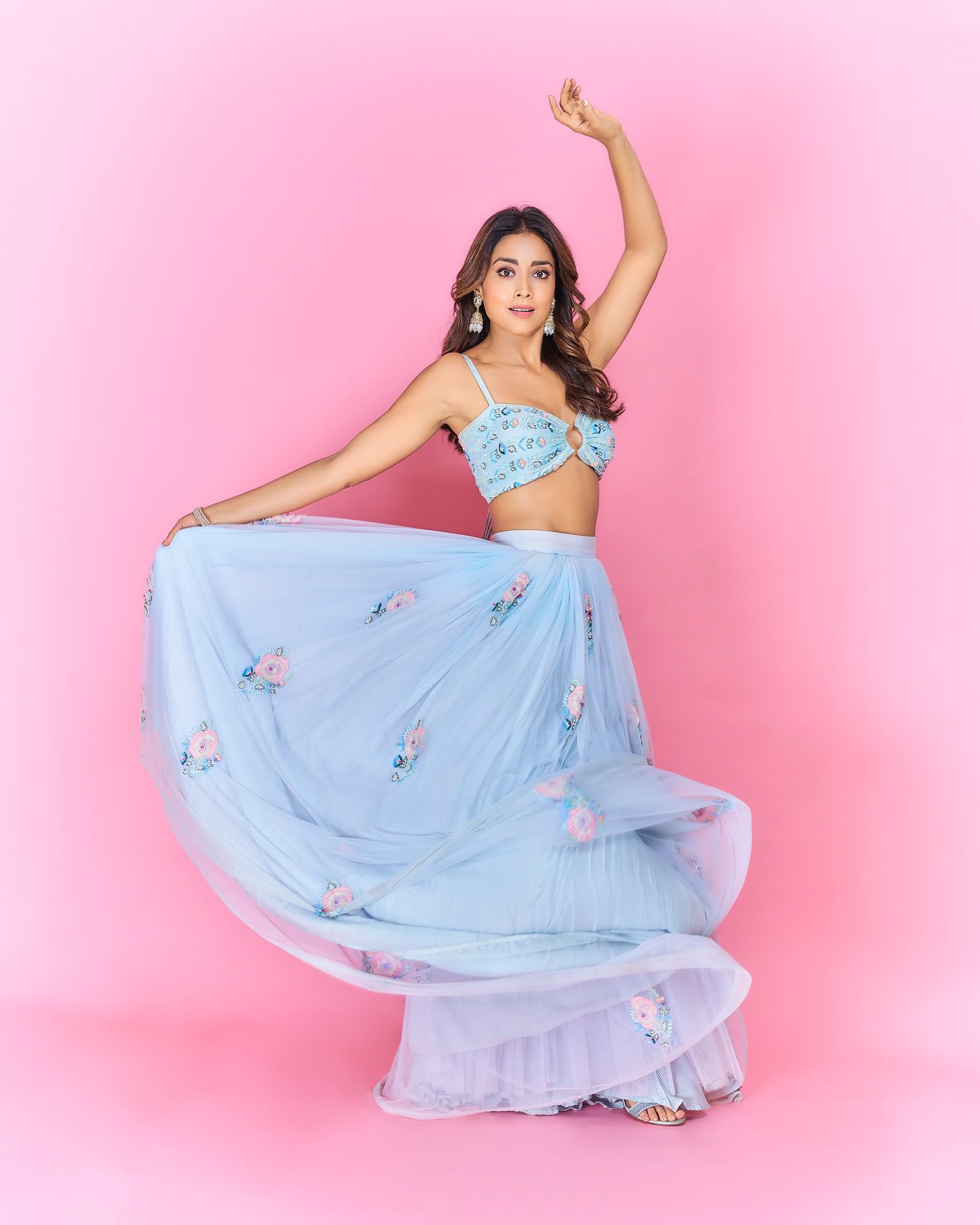 తాజాగా ప్యాస్టెల్ బ్లూ కలర్ ట్రెండీ లెహంగాలో సొగ‌సుల వ‌ల విసిరింది. త‌న నాజూకు అందాల‌తో డ్రెస్ కు మ‌రింత అందాన్ని జోడించింది. ఏజ్ 40 అయిన స్వీట్ 16లా శ్రియా మిస్మ‌రైజ్ చేయ‌డంతో కుర్ర‌కారు చూపు తిప్పుకోలేక‌పోతున్నారు.