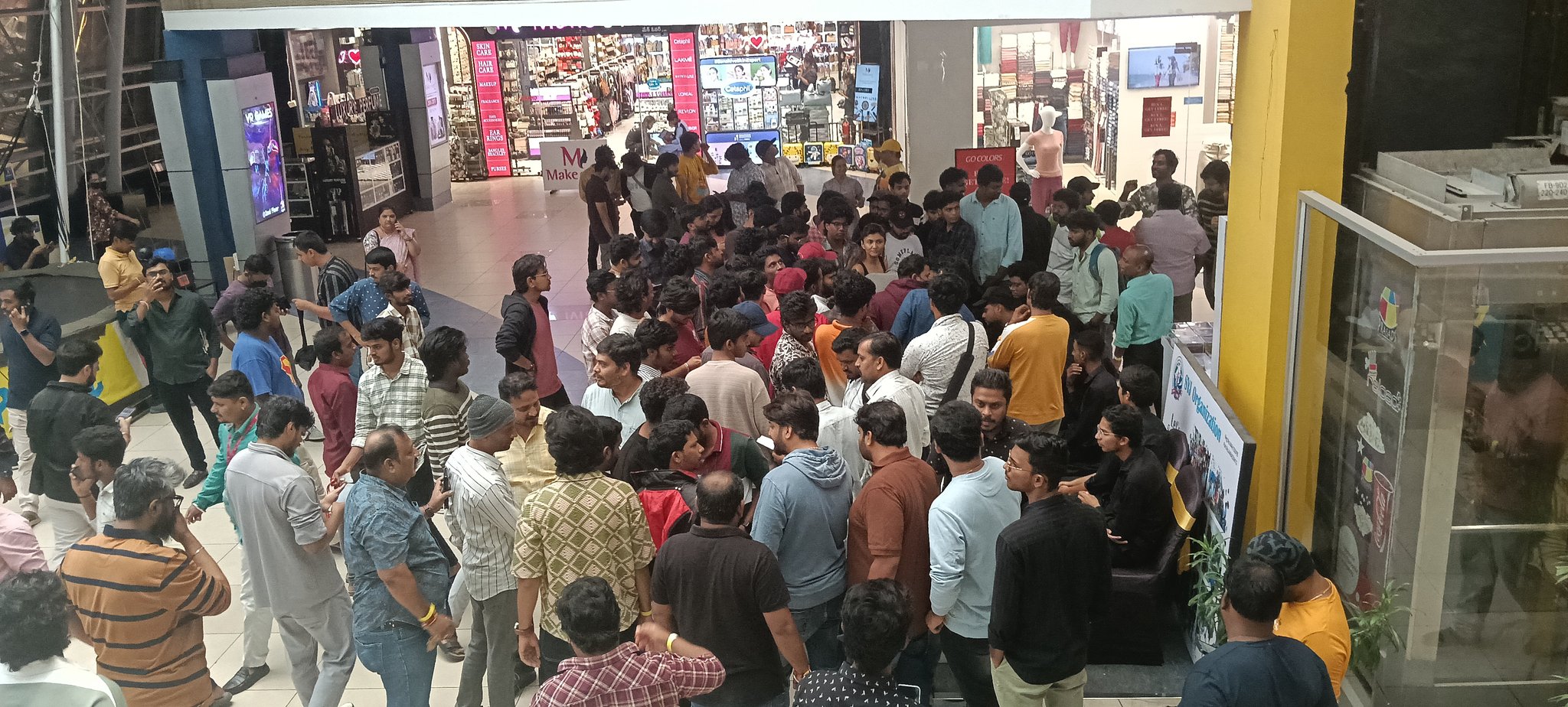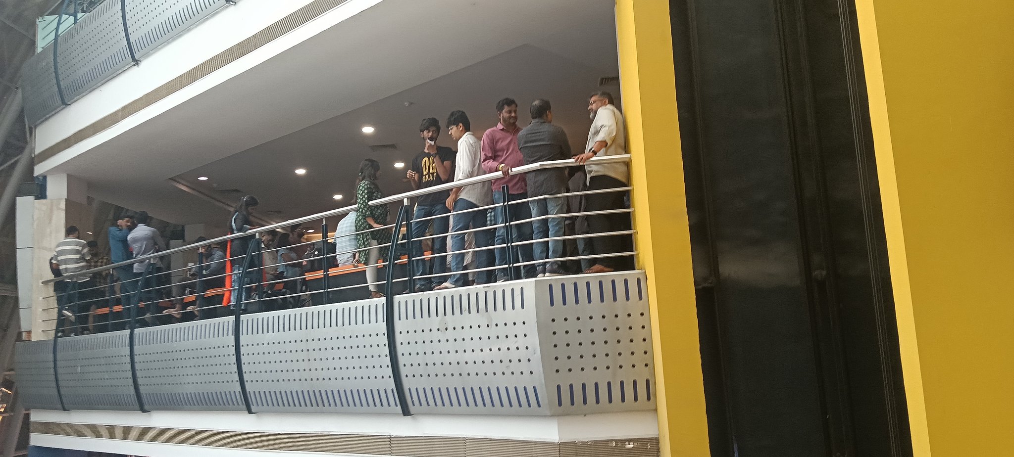 The mall’s main entrance, normally bustling with controlled footfall, turned into a bottleneck as fans flooded the atrium area, many jostling for space, clicking selfies, and trying to get a better view of the screens. Despite repeated announcements and visible efforts by staff, the crowd only thickened, spilling over into nearby store fronts and stairwells. Security barriers proved ineffective against the sheer number of moviegoers.