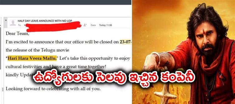 రజనీకాంత్ తో పాటు ఇతర స్టార్ హీరోల చిత్రాలు విడుదలవుతున్నాయంటే బడా కంపెనీలు సైతం ఉద్యోగులకు సెలవు ఇచ్చిన సందర్భాలు ఉన్నాయి.ఈ రోజున పవన్ కళ్యాణ్ నటించిన హరిహర వీరమల్లు సినిమా పాన్ ఇండియా లెవెల్లో రిలీజ్ అయ్యింది. యూకే కంపెనీ పవన్ కళ్యాణ్ నటించిన హరిహర వీరమల్లు సినిమా విడుదల సందర్భంగా తమ కంపెనీలో పనిచేసే ఉద్యోగులకు హాఫ్ డే సెలవుని ప్రకటించారు. ఈ విషయాన్ని ట్విట్టర్ వేదికగా బాలు రెడ్డి యూకే అనే వ్యక్తి పోస్ట్ చేశారు. పవన్ కళ్యాణ్ కి వీరాభిమానిగా ఉంటూ ఎప్పటికప్పుడు పోస్టులు షేర్ చేస్తూ ఉంటారు.