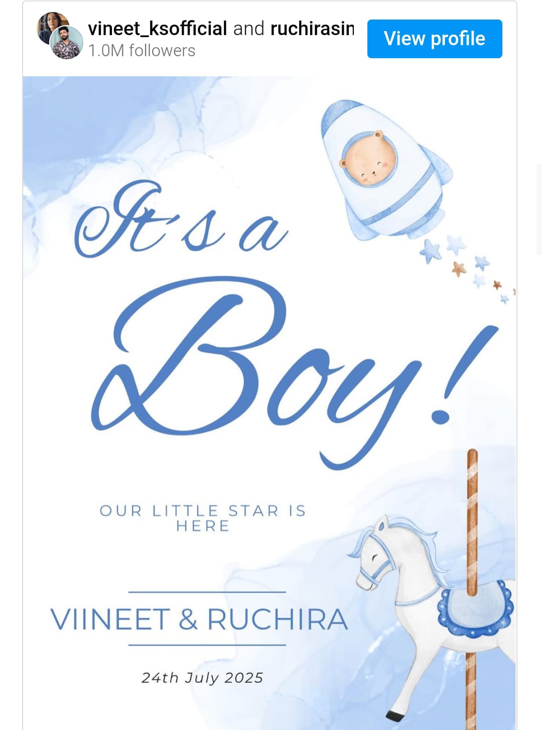 Actor Viineet Kumar Siingh and his wife Ruchira welcomed a baby boy on July 24, 2025, announcing the joyous news on Instagram.