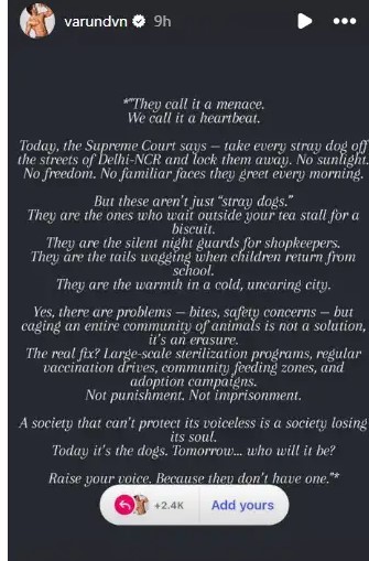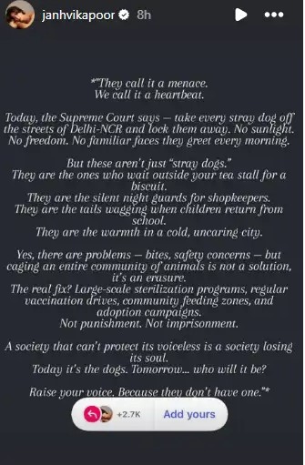 Bollywood actresses janhvi kapoor and actor varun dhawan have expressed their displeasure on social media, calling this order ruthless and unfair. Janhvi shared a petition in her instagram story and wrote that these animals living on the streets are not just stray dogs, but they are a part of our society.
