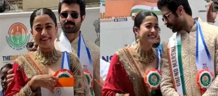 ఇటీవల అమెరికాలోని న్యూయార్క్లో భారత 79వ స్వాతంత్ర్య దినోత్సవం సందర్భంగా భారత కాన్సులేట్ ఆధ్వర్యంలో నిర్వహించిన "ఇండియా డే పరేడ్" ఘనంగా జరిగింది. ఇది అమెరికాలో జరిగే అతిపెద్ద భారతీయ పరేడ్. ఈ వేడుకకు అనేకమంది భారతీయ–అమెరికన్లు, విదేశీ స్నేహితులు హాజరయ్యారు. ముఖ్యంగా సినీ స్టార్లు ప్రత్యేక ఆకర్షణగా నిలిచారు. ఈ కార్యక్రమానికి 2025 సంవత్సరానికి గాను గ్రాండ్ మార్షల్గా హాజరైన విజయ్ దేవరకొండ, రష్మిక మందన్న భారతీయ సంస్కృతి వైభవాన్ని ప్రతినిధులుగా చాటి చెప్పారు. వీరిని చూసిన ప్రతి ఒక్కరూ ఎంతో ఆనందం వ్యక్తం చేశారు. ఈ పరేడ్లో వీరిద్దరినీ జంటగా చూసిన వారు, “అచ్చం భార్యాభర్తలాగే ఉన్నారు. నిజమైన భార్యాభర్తలు కూడా ఇంత ఆనందంగా ఉండరు. త్వరలోనే పెళ్లి చేసుకుని హ్యాపీగా ఉండాలి” అంటూ కామెంట్లు చేస్తున్నారు ..