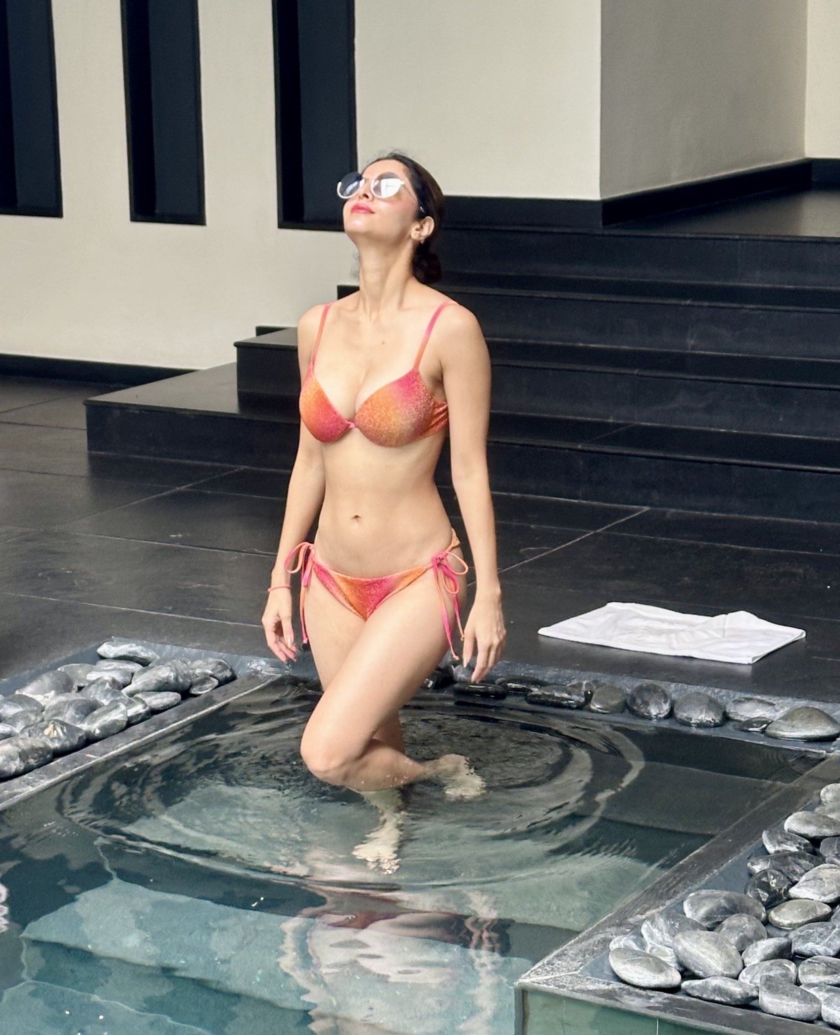 తాజాగా బిగినిలో మంటలు రేపింది. ఆరెంజ్ కలర్ బికినీలో గాగుల్స్ పెట్టుకొని స్విమ్మింగ్ పూల్ లోకి వయ్యారంగా దిగుతూ ఫోటోల‌కు పోజులిచ్చింది. మ‌త్తెక్కించే అందాల‌తో మంచి ట్రీట్ ఇచ్చింది. వేదిక చీర‌లో క‌న‌ప‌డితేనే త‌ట్టుకోలేని కుర్రాళ్లు.. బికినీలో ద‌ర్శ‌న‌మిస్తే ఆగుతారా? మెట‌లెక్కిపోతున్నారు. వేదిక అందాల‌ను ఆకాశానికి ఎత్తేస్తూ కామెంట్ల మోత మోగిస్తున్నారు.