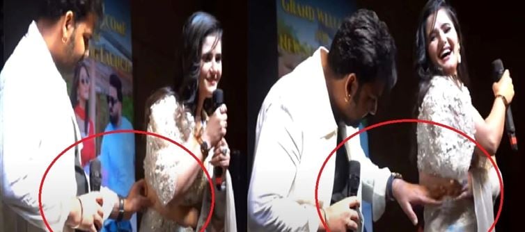 భోజ్పురి ఇండస్ట్రీలో స్టార్ నటుడుగా పేరు సంపాదించిన పవన్ సింగ్ ఒక ఈవెంట్ లో పాల్గొనగా.. అక్కడ హీరోయిన్ అంజలి స్టేజ్ మీద మాట్లాడుతూ ఉండగా.. ఆమె నడుమును తాకి ఏదో ఆమెతో చెప్పినట్లు ఒక వీడియో వైరల్ అవుతోంది . అయితే హీరోయిన్ అంజలి మాత్రం ఆ హీరో అలా తాకడంతో అసౌకర్యంగా ఫీల్ అయినా కూడా.. ఆ భావాలను ముఖంలో చూపించకుండా కేవలం నవ్వుతూనే కనిపిస్తూ ఉన్నట్టుగా వీడియోలో కనిపిస్తోంది. కాని పవన్ సింగ్ మాత్రం పదేపదే హీరోయిన్ అంజలి నడుమును తాకుతూ ఏదో శుభ్రం చేస్తున్నట్లుగా కనిపించారు.