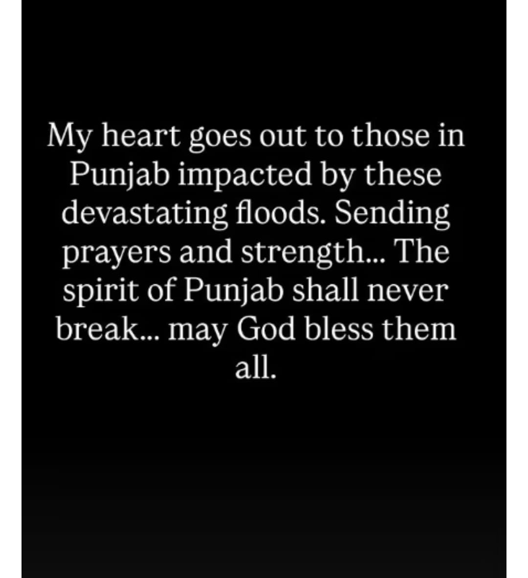 His words: “My heart melts after hearing the pain of the people affected by this devastating flood in Punjab. I am sending them prayers and courage. May Punjab's courage never break. May god bless them all.”