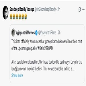షూటింగ్ కి ఎక్కువ రోజులు ఇవ్వలేనని అలాగే డేట్స్ కేటాయించాక కూడా ఒక ప్రత్యేక సమయంలోనే నేను షూట్ కి వస్తాను అని కండిషన్లు పెట్టడంతో ఇవేవీ నచ్చక డైరెక్టర్ తీసేశారు.ఇప్పుడు కల్కి-2 నుండి కూడా తీసేయడంతో సందీప్ రెడ్డి వంగా బాధ ఏంటో అందరికీ తెలిసి వచ్చింది. ఎందుకంటే స్పిరిట్ మూవీ కి దీపికను తీసేసి త్రిప్తిని పెట్టుకున్న సమయంలో సందీప్ పై వ్యతిరేకత వచ్చింది. కానీ ఇప్పుడు కల్కి -2 విషయంలో కూడా దీపికను తీసేసేసరికి ఆయన బాధ ఏంటో అందరికీ అర్థమైంది. అయితే వైజయంతి మూవీస్ బ్యానర్ పెట్టిన పోస్ట్ కి సందీప్ రెడ్డి వంగా నవ్వుతూ ఉన్న ఎమోజిస్ ని షేర్ చేయడంతో చాలామంది దీపిక ఫ్యాన్స్ హర్ట్ అయిపోయి సందీప్ రెడ్డి వంగా పై నెగిటివ్ కామెంట్లు చేస్తున్నారు.కానీ కల్కి పార్ట్ -2నుండి తీసేస్తే సందీప్ రెడ్డి వంగా కి ఎంత ఆనందంగా ఉందో ఆయన షేర్ చేసిన ఒక్క పోస్టు ద్వారా అర్థం అవుతుంది అంటున్నారు చాలామంది నెటిజెన్లు.