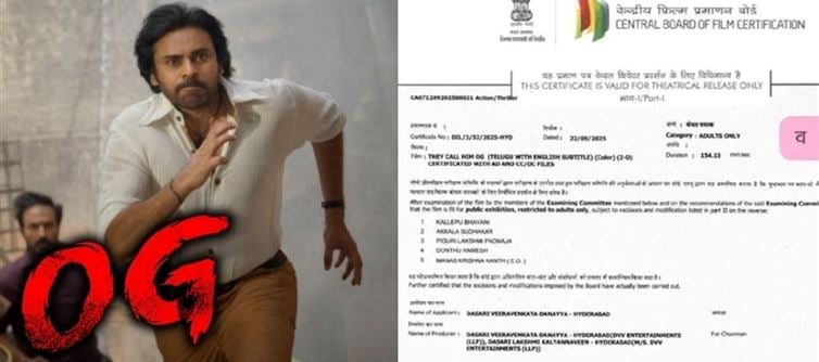 అయితే ఓజి టీమ్ ఎందుకు అడల్ట్స్ ఓన్లీ తీసుకున్నారు? అన్న ప్రశ్నకి సమాధానం క్లియర్గా ఉంది. సెన్సార్ బోర్డు ఇచ్చిన కట్స్ లిస్ట్ దాదాపు 20కి పైగా ఉందట. అవి చేయాల్సి వస్తే సినిమాలో ఉన్న ఇంటెన్సిటీ, గ్యాంగ్స్టర్ డ్రామా ఫీల్ పూర్తిగా తగ్గిపోతుందని దర్శకుడు సుజిత్, పవన్ కళ్యాణ్ భావించారు. అందుకే పెద్ద కట్స్ చేయకుండా A సర్టిఫికెట్ ఎంచుకున్నారట. ఈ సినిమాలో ఇంటిమసీ సీన్లు లేకపోయినా, వయోలెన్స్ ఎక్కువగా ఉండటం వల్లే ఈ సర్టిఫికెట్ వచ్చిందని క్లారిటీ ఇచ్చారు. పవన్ ఫ్యాన్స్ అయితే ఇదే మాస్ ఫీల్ ఇస్తుందని డబుల్ ఎక్సైట్మెంట్లో ఉన్నారు. ఇక ఫ్యామిలీస్ మాత్రం ఎక్కడ చూడాలన్నదానిపై ఆలోచనలో పడ్డారు. ఇక సెప్టెంబర్ 24 రాత్రి 10 గంటలకు ఫ్యాన్స్ ఎదురుచూపులు ముగియబోతున్నాయి. నిముషాలు కూడా యుగాల్లా గడుస్తున్నాయి. పవన్ మార్క్ మాస్ రాంపేజ్ మొదలవ్వడానికి కౌంట్డౌన్ మొదలైపోయింది!