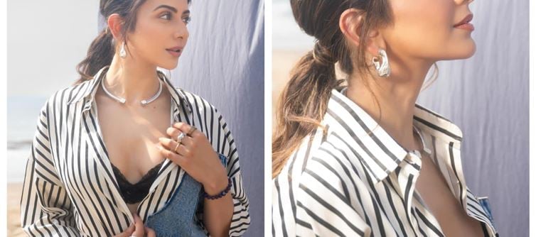 కానీ ప్రస్తుతం మాత్రం రకుల్ తెలుగు సినిమాల్లో నటించడంపై పెద్దగా ఆసక్తి చూపడం లేదు. ఈమె ఎక్కువ శాతం ఈ మధ్య కాలంలో తమిళ్ , హిందీ సినిమాలలో నటిస్తోంది. ఇకపోతే సినిమాల్లో అందాలను అదిరిపోయే రేంజ్ లో అందాలను ఆరబోస్తూ కుర్రకారు ప్రేక్షకులకి కిక్ ఎక్కిస్తున్న ఈ బ్యూటీ సోషల్ మీడియాలో కూడా అందుకు ఏ మాత్రం తగ్గడం లేదు. తాజాగా ఈ బ్యూటీ కి సంబంధించిన కొన్ని వెరీ హాట్ లుక్ లో ఉన్న ఫోటోలు సూపర్ గా వైరల్ అవుతున్నాయి. తాజాగా ఈ బ్యూటీ అదిరిపోయే వెరీ హాట్ లుక్ లో ఉన్న డ్రెస్ ను వేసుకొని తాను వేసుకున్న షర్టు పై బటన్స్ విప్పేసి డిఫరెంట్ డిఫరెంట్ యాంగిల్స్ లో తన హాట్ లో దుస్తులు ప్రదర్శితం అయ్యేలా అలాగే ఎద అందాలు ప్రదర్శితం అయ్యేలా ఫోటోలకు స్టిల్స్ ఇచ్చింది. ఈ ఫోటోలలో రకుల్ వెరీ హాట్ లుక్ లో ఉండడంతో ప్రస్తుతం ఈ బ్యూటీ కి సంబంధించిన ఈ ఫోటోలో వైరల్ అవుతున్నాయి.