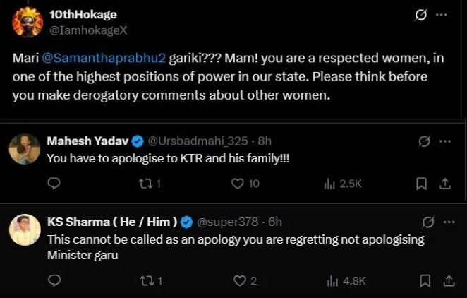 However, she did not mention samantha Ruth Prabhu, naga Chaitanya, or ktr in her apology.