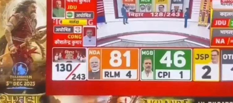 ఓవైపు దేశం మొత్తం బిహార్ ఎన్నికల ఫలితాల టెన్షన్‌లో మునిగిపోయింది! టీవీలు ఆన్ చేసిన ప్రతి ఒక్కరూ.. ఎన్డీఏ, మహాఘట్‌బంధన్ అభ్యర్థుల ఆధిక్యత, ఓట్ల లెక్కలు చూస్తూ ఉత్కంఠగా గమనిస్తున్నారు. సరిగ్గా ఈ పొలిటికల్ హీట్ మధ్యలో.. ప్రేక్షకులకు ఎవరూ ఊహించని ఒక మాస్ సర్‌ప్రైజ్ తగిలింది! రాజకీయ నాయకుల ఫొటోలు, లీడ్ నంబర్లతో నిండిన జాతీయ న్యూస్ ఛానెళ్ల స్క్రీన్‌పై సడెన్‌గా బాలకృష్ణ ప్రత్యక్షమవడం ఇప్పుడు దేశవ్యాప్తంగా పెను చర్చకు దారి తీసింది! హై- వోల్టేజ్ పాలిటిక్స్.. మాస్ సినిమా! 'అఖండ 2: తాండవం' సినిమా మేకర్స్ ప్రమోషన్లను నెక్స్ట్ లెవెల్‌కు, ఏకంగా దేశ రాజకీయాల స్క్రీన్‌పైకి తీసుకెళ్లారు! కేవలం సినిమా ఛానెళ్లలో కాకుండా, దేశం అత్యంత ఆసక్తిగా గమనిస్తున్న ఎన్నికల ఫలితాల లైవ్ కవరేజీని ఎంచుకున్నారు.
