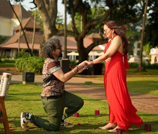 Photos show Nomish on one knee, holding Rupal’s hand, and lovingly embracing her.