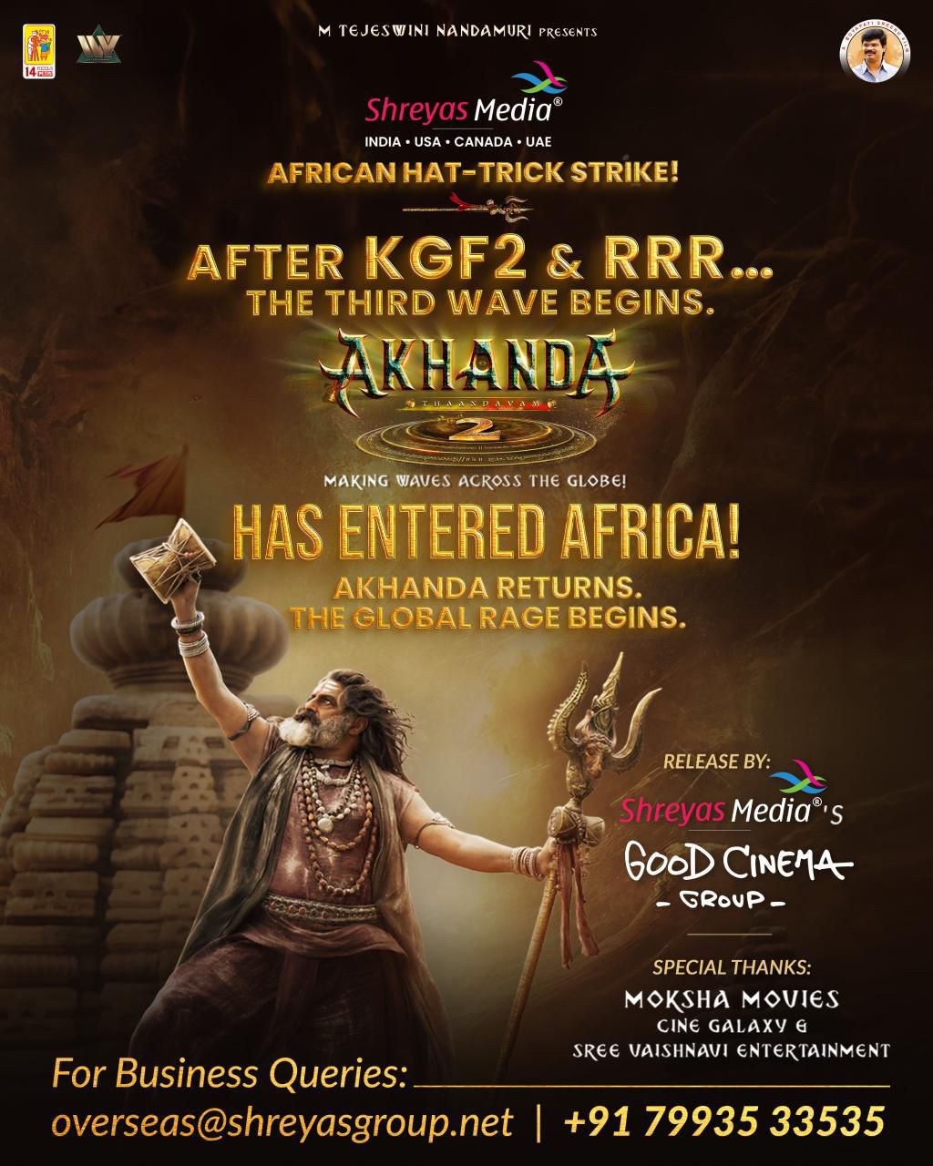 అఖండ మూవీ మంచి విజయం సాధించిన తర్వాత ఆ మూవీ కి కొనసాగింపుగా అఖండ 2 మూవీ ని రూపొందించనున్నట్లు మేకర్స్ ప్రకటించారు. ఇక కొంత కాలం క్రితమే అఖండ 2 మూవీ యొక్క షూటింగ్ను ప్రారంభించారు. డిసెంబర్ 5 వ తేదీన ఈ సినిమాని ప్రపంచ వ్యాప్తంగా విడుదల చేయనున్నారు. ఈ సినిమా విడుదల తేదీ దగ్గర పడడంతో ఇప్పటికే ఈ మూవీ బృందం వారు ఈ సినిమా ప్రచారాలను కూడా మొదలు పెట్టారు. ఇక ఈ సినిమా విడుదల తేదీ దగ్గర పడడంతో ఈ మూవీ కి సంబంధించిన అన్ని ఏరియాలో థియేటర్ హక్కులను ఈ మూవీ బృందం వారు అమ్మి వేస్తూ వస్తున్నారు. అందులో భాగంగా తాజాగా ఈ మూవీ బృందం ఈ సినిమాకు సంబంధించిన ఆఫ్రికా థియేటర్ హక్కులను అమ్మి వేశారు. తాజాగా అందుకు సంబంధించిన అధికారిక ప్రకటనను కూడా ఈ మూవీ బృందం విడుదల చేసింది.