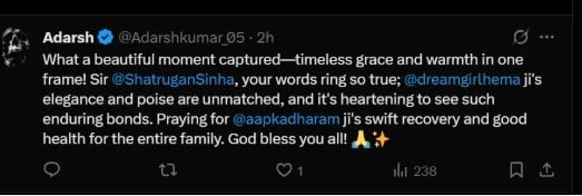 Shatrughan Sinha shared the visit on Instagram, writing, “Our prayers are with her. Along with my wife Poonam Sinha, I met hema malini, our dear family friend, one of the finest human beings, an actress, a brilliant artist, and a worthy MP. We also inquired about the well-being of our elder brother and his family.”