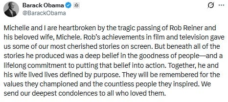Former President barack obama also shared his sorrow, highlighting Rob Reiner’s contributions to storytelling and humanity.