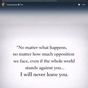 రీసెంట్గా త్రిష విజయ్ ని కలుపుతూ తమిళనాడు బీజేపీ ఎంపీ నైనార్ నాగేంద్రన్ వివాదాస్పద వ్యాఖ్యలు చేశారు. విజయ్ రాజకీయాల్లో కొనసాగాలంటే ముందు బయటికి రావాలి అంటూ మాట్లాడడంతో ఈ వ్యాఖ్యలపై త్రిష ఫైర్ అయింది. ఒక బాధ్యతాయుతమైనటువంటి స్థానంలో ఉన్న రాజకీయ నేత ఇలా ఒక మహిళ వ్యక్తిగత జీవితం గురించి అసభ్యకర వ్యాఖ్యలు చేయడం బాధాకరం అంటూ ఘాటుగా స్పందించింది.ఇక త్రిష మాటలపై బీజేపీ ఎంపీ కూడా స్పందించి త్రిషకి క్షమాపణలు చెప్పారు. ఇదిలా ఉంటే ఈ వివాదం కొనసాగుతున్న సమయంలోనే త్రిష తన సోషల్ మీడియా ఖాతాలో ఒక ఇంట్రెస్టింగ్ పోస్ట్ పెట్టింది.ఆ పోస్టులో ఏముందంటే.. "మన మీద ఎంత వ్యతిరేకత వచ్చినా.. ఏం జరిగినా.. ఈ ప్రపంచం మొత్తం నీకు వ్యతిరేకంగా ఉన్నా..నేను మాత్రం నిన్ను ఎప్పటికీ విడిచి పెట్టను"..అంటూ పోస్ట్ పెట్టింది.