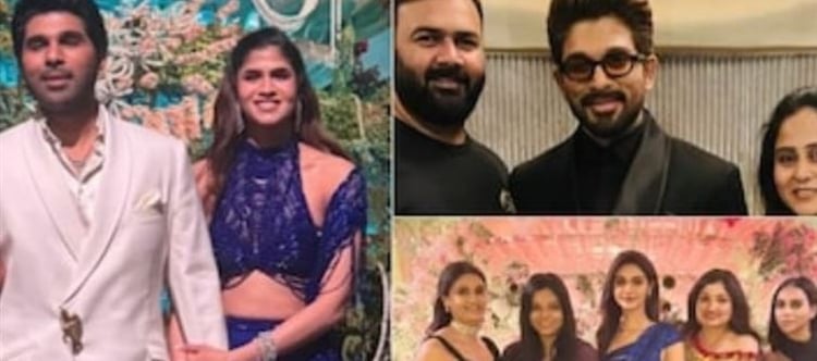 Sneha reddy impressed in a dark blue sequin saree, while allu arjun opted for a stylish all-black suit.