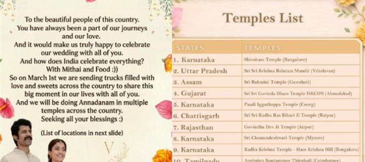 తమ పెళ్లి ఆనందాన్ని దేశవ్యాప్తంగా ఉన్న ప్రతి ఒక్కరితో కూడా పంచుకోవాలని నిర్ణయం తీసుకుంది ఈ జంట. అందులో భాగంగా ఇండియాలో అన్ని రాష్ట్రాలలో కొన్ని ప్రాంతాలను ఎంచుకొని మరి అక్కడ తమ తరఫున మిఠాయిలు పంచడమే కాకుండా పలు దేవాలయాలలో అన్నదాన కార్యక్రమాలు కూడా ఏర్పాటు చేసేలా ప్లాన్ చేశారు. మా పెళ్ళికి మీరు చూపించిన ప్రేమాభిమానాలకు మా చిన్న కృతజ్ఞత అంటూ రష్మిక తమ ఇద్దరి తరఫున సోషల్ మీడియాలో ఒక పోస్ట్ ని షేర్ చేసింది.