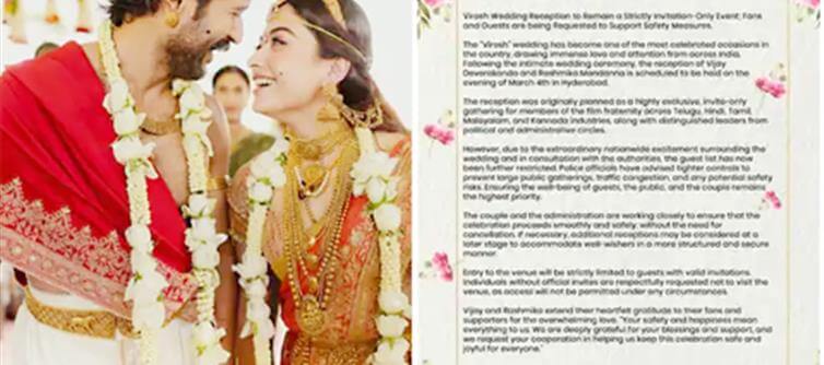 ఈ వేడుక హైప్రొఫైల్ ఈవెంట్గా మారడంతో అభిమానుల్లో కూడా అపారమైన ఉత్సాహం నెలకొంది. అయితే ఇదే సమయంలో విజయ్ దేవరకొండ మరియు రష్మిక మందన్న ఒక ముఖ్యమైన నిర్ణయం తీసుకున్నారు. అభిమానుల ప్రేమకు ఎప్పుడూ కృతజ్ఞతలు తెలుపుతూ ఉండే ఈ జంట, తమ రిసెప్షన్ కార్యక్రమానికి సంబంధించి ఒక అధికారిక ప్రకటన విడుదల చేసింది.