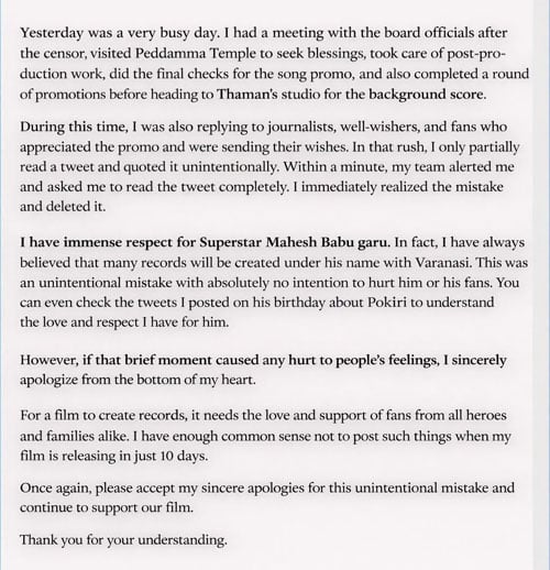 తాను ఆ విషయాన్ని గమనించేలోపే తన టీమ్ వెంటనే అలర్ట్ చేసిందని, వెంటనే ఆ రిప్లైను డిలీట్ చేశానని తెలిపారు. ఈ ఘటనలో ఎలాంటి తప్పుదారుణం లేదని, అది పూర్తిగా అనుకోకుండా జరిగిన పొరపాటు మాత్రమేనని ఆయన పేర్కొన్నారు.అంతేకాకుండా టాలీవుడ్ సూపర్ స్టార్ మహేశ్ బాబు పట్ల తనకు ఎంతో గౌరవం ఉందని కూడా ఆయన స్పష్టం చేశారు. మహేష్ బాబు నటిస్తున్న తాజా సినిమా భారీ విజయాన్ని సాధించి ఎన్నో రికార్డులు సృష్టిస్తుందని తాను నమ్ముతున్నానని చెప్పారు. తన వైపు నుంచి ఎలాంటి నెగిటివ్ ఉద్దేశం లేదని, పూర్తిగా అనుకోకుండా జరిగిన ఈ ఘటనకు క్షమాపణలు కోరుతున్నట్టు తెలిపారు.ఈ వివరణతో సోషల్ మీడియాలో జరుగుతున్న చర్చలకు చాలా వరకు ముగింపు లభించింది. అభిమానులు కూడా ఈ విషయాన్ని అర్థం చేసుకుని ఇకపై ఈ వివాదాన్ని కొనసాగించాల్సిన అవసరం లేదని భావించారు. మొత్తానికి చిన్న పొరపాటు కారణంగా మొదలైన ఈ సోషల్ మీడియా రచ్చ, దర్శకుడు ఇచ్చిన క్లారిటీతో నెమ్మదిగా ముగిసినట్టే కనిపిస్తోంది.ఇక ప్రస్తుతం పవన్-హారీష్ కాంబినేషన్లో తెరకెక్కుతున్న ఉస్తాద్ భగత్ సింగ్ సినిమా మీద అభిమానుల్లో భారీ అంచనాలు ఉన్నాయి. ఈ సినిమా విడుదలకు ముందే సోషల్ మీడియాలో పెద్ద హైప్ ఏర్పడింది. దీంతో ఈ చిత్రానికి సంబంధించిన ప్రతి చిన్న అప్డేట్ కూడా అభిమానుల్లో ఆసక్తిని పెంచుతోంది.