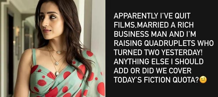 సాధారణంగా సెలబ్రిటీలు తమపై వచ్చే రూమర్లను లైట్ తీసుకుంటారు లేదా సీరియస్గా లీగల్ నోటీసులు పంపిస్తారు. కానీ త్రిష మాత్రం రూమర్ రాయుళ్ల పరువు తీసేలా ఓ రేంజ్లో సెటైర్లు వేసింది.“నేను సినిమాలకు గుడ్బై చెప్పేశానట.. ఓ రిచ్ బిజినెస్మెన్ను పెళ్లి చేసుకున్నానట.. అంతేకాదు, మాకు పుట్టిన నలుగురు పిల్లలకు నిన్నే రెండేళ్లు కూడా నిండాయట.. ఇవి కాకుండా ఇంకేమైనా కొత్తవి యాడ్ చేయాలా? లేదా ఈ రోజుకి ఈ కల్పిత కథల కోటా పూర్తయిందా?” అంటూ త్రిష పెట్టిన పోస్ట్ ఇప్పుడు ఇంటర్నెట్లో సునామీ సృష్టిస్తోంది. తనపై జరుగుతున్న ప్రచారంలో ఏమాత్రం నిజం లేదని, అవన్నీ ఎవరో కావాలని క్రియేట్ చేస్తున్న ‘స్క్రిప్ట్’ మాత్రమేనని త్రిష పరోక్షంగా తేల్చిచెప్పింది. ‘క్వీన్’ ఇచ్చిన ఈ అదిరిపోయే కౌంటర్కు నెటిజన్లు ఫిదా అయిపోతున్నారు.
