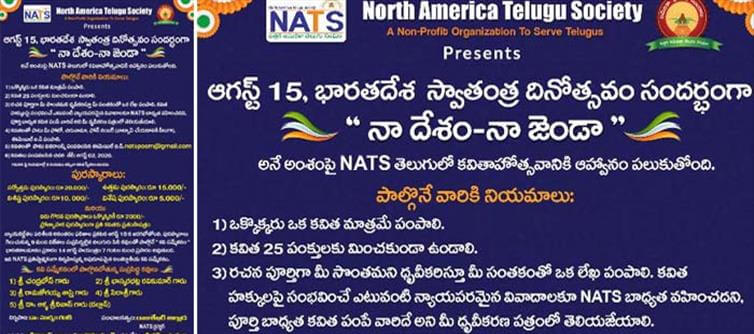 ఐదు గౌరవ పురస్కారాలు ఒక్కొక్కరికీ రూ 2000/- "పురస్కారాలు గెలుపొందిన వారు.. తొమ్మిది మంది కవులూ, నలుగురు సినీ కవులతో కవితా సమ్మేళనంలో పాల్గొంటారు. ఈ కార్యక్రమాన్ని ఆగస్ట్ 14 సాయంత్రం నాట్స్ యూట్యూబ్ ఛానల్లోనూ, సామాజిక మాధ్యమంలోనూ ప్రసారం చేస్తాం", అని సంచాలకులు శ్రీ రాజశేఖర్ అల్లాడ తెలిపారు.