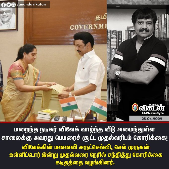 Famous film actor vivek passed away last year due to sudden illness. His family met with chief minister MK stalin and demanded that vivek name the street where he lived in his memory.